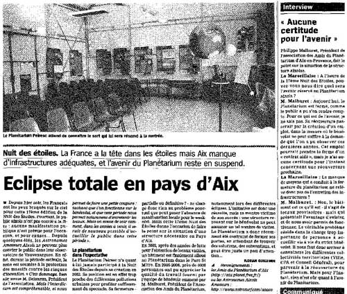 Le Planétarium Peiresc n'a quant à lui jamais participé à la Nuit des Étoiles depuis sa création en 2002. Sa position est en effet trop proche des différentes pollutions urbaines pour profiter suffisamment du spectacle. Sa fermeture – partielle ou définitive ? – ne change donc rien au problème ponctuel que peut poser l'absence de manifestation locale pour le week-end. Mais cette 17e Nuit des Étoiles donne l'occasion de faire le point sur la situation d'une structure nécessaire au Pays d'Aix. En 2002, après des années de lutte pour l'obtention de locaux viables, un bâtiment est finalement alloué au Planétarium dans le Parc St Mitre. En 2005-2006, près de 4000 personnes ont pu apprécier la qualité du travail fourni par l'équipe de bénévoles emmenée par M. Malburet, Président de l'Association des Amis du Planétarium, notamment lors des différentes éclipses. L'initiative est donc une réussite, mais se montre victime de son succès : une structure reposant sur le bénévolat ne peut assumer un tel nombre de visites. Le Planétarium a donc récemment été contraint de fermer ses portes, en attendant de trouver des solutions, des subventions, et peut-être juste un peu d'attention…