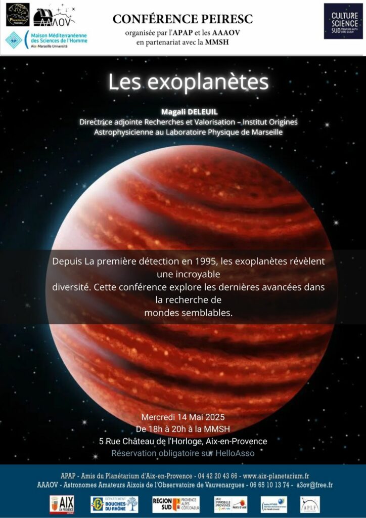 Nous sommes ravis de vous présenter notre cycle de conférences mensuelles, en partenariat avec les AAAOV, Astronomes Amateurs Aixois de l’Observatoire de Vauvenargues; et la MMSH, Maison Méditerranée des Sciences de l’Homme :