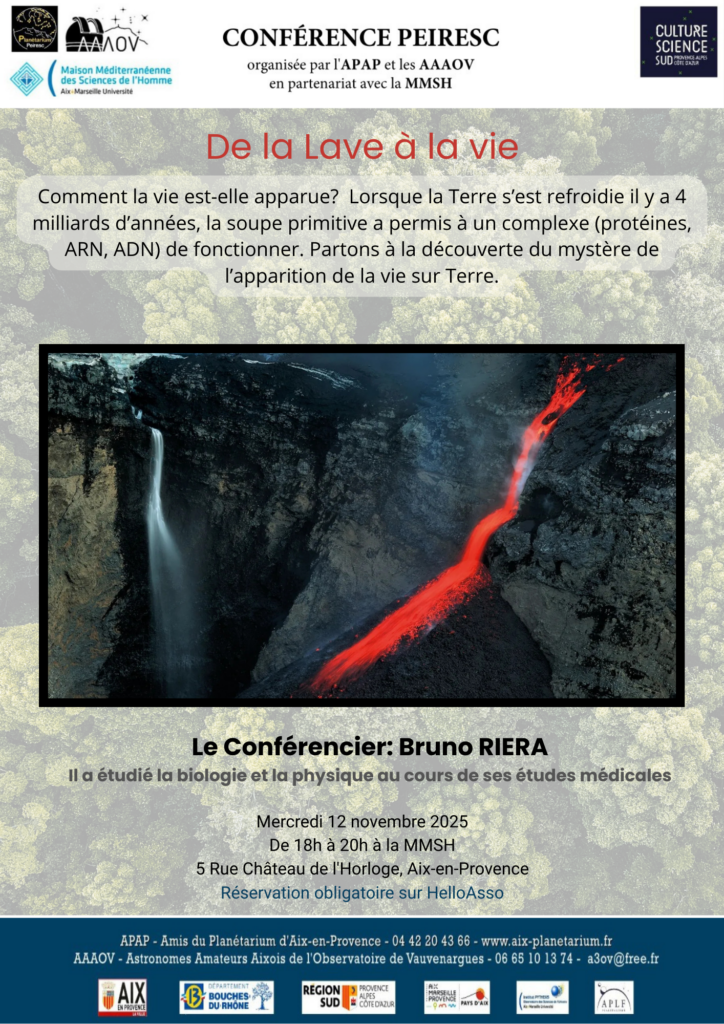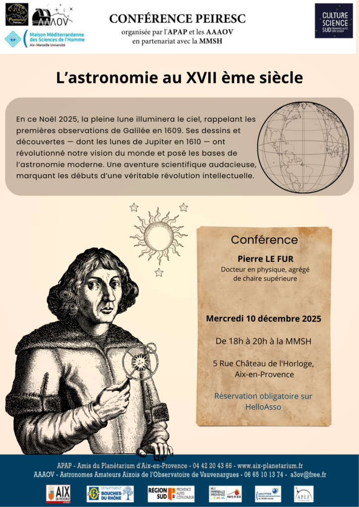 Nous sommes ravis de vous présenter notre cycle de conférences mensuelles, en partenariat avec les AAAOV, Astronomes Amateurs Aixois de l’Observatoire de Vauvenargues; et la MMSH, Maison Méditerranée des Sciences de l’Homme :