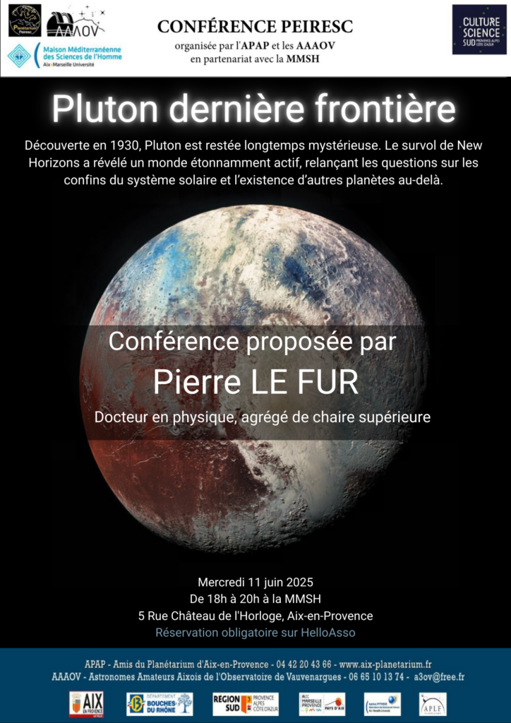 Les conférences seront désormais co-organisées par l’A.P.A.P. (association des Amis du Planétarium d’Aix en Provence) et l’A.A.A.O.V.  (association des Astronomes Amateurs Aixois de l’Observatoire de Vauvenargues)