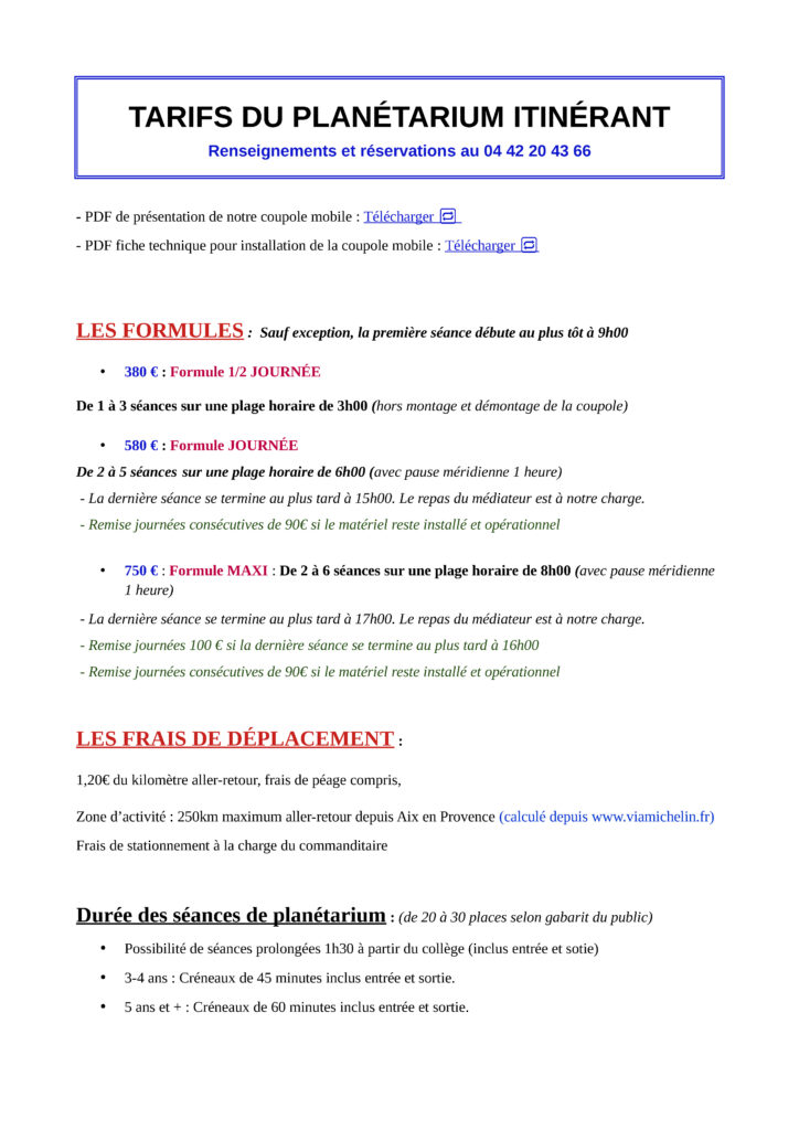 Il est conseillé de nous présenter votre demande par courriel (contact@aix-planetarium.fr), en précisant un numéro de téléphone sur lequel nous pourrons vous joindre (et éventuellement les créneaux à privilégier).